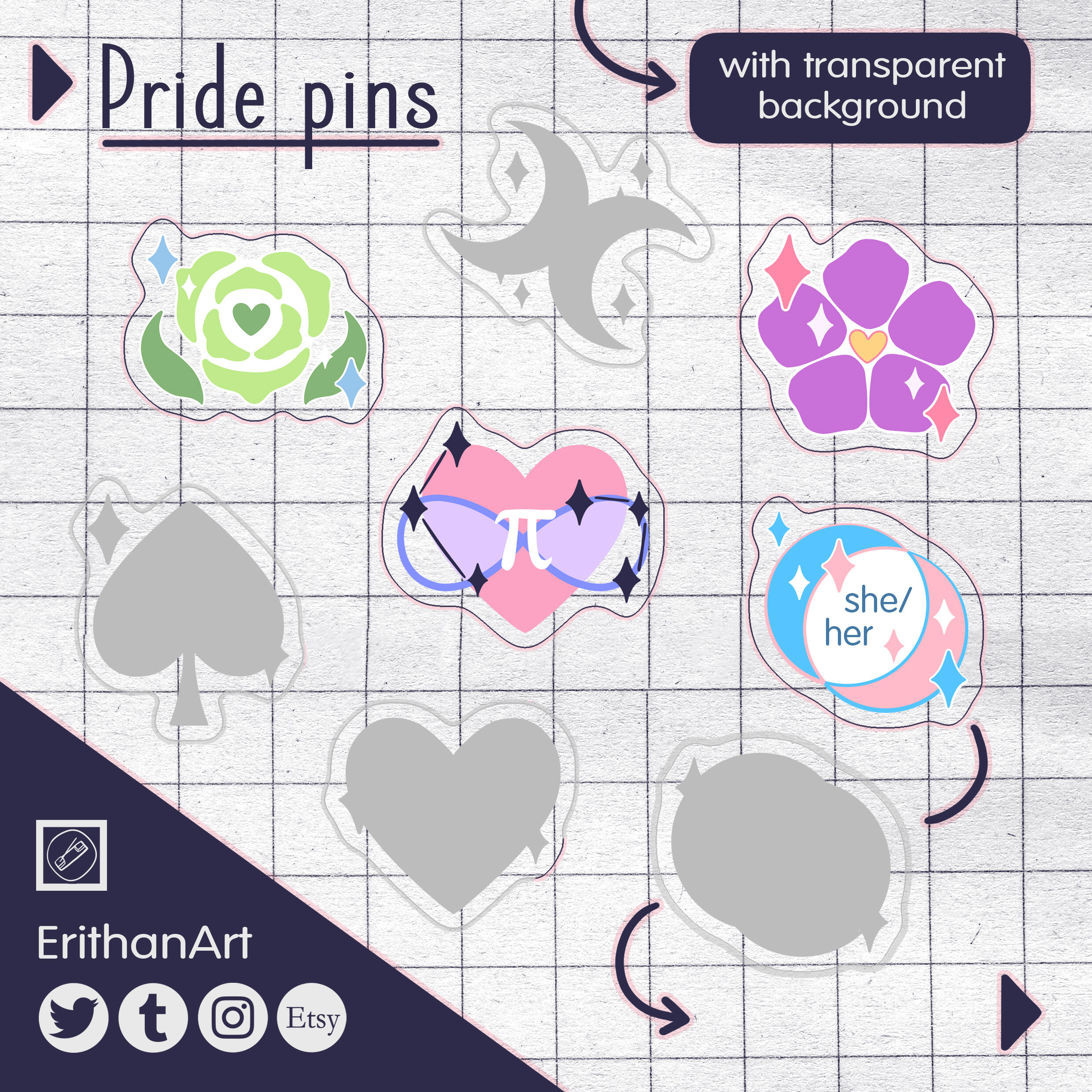 Diseños originales basados en las diversidades de atracción y relaciones.12€ (6cm): espada lesbiana, arco/lira gay, dagas bi, libro asexual, escudo aroace y dragones.10€ (4cm): aquileano, sáfica, bi (descatalogado), trans, no binarie, poliamorose, anarquista relacional, leather, shibari y neurodivergente.8€ (3cm): biNo tendré expuesto en Japan Weekends: arromántique, asexual, aroace y demisexual (4cm)